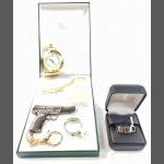 JAMES BOND gift set from the British Gold Company to include a limited edition pocket watch (17/1000), a gun-shaped keyring and a medallion signed by Daniel Craig, (some damage to box), also 2 SPECTRE rings size 11 and 12