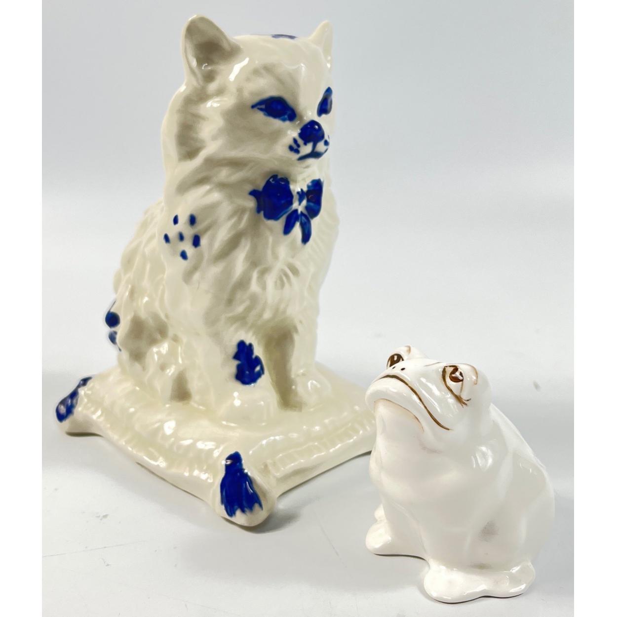 Early c20th Century THE FROG AND THE CAT - a sitting Persian style cat on a cushion ornament - dimensions 15.5cm height 8cm width and a small white Bone China sitting frog ornament by COALPORT(SO CUTE!) - dimensions 6.5cm height 5.5cm width approx