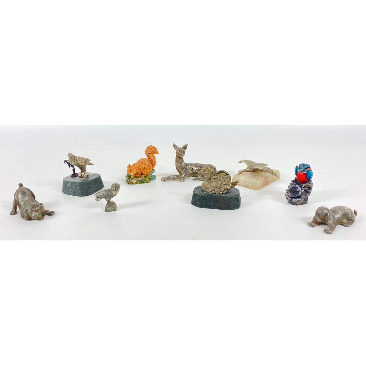 A collection of small animals, mainly white metal to include a deer, 2 puppies, a swan etc plus a statue of Eros, largest piece 8cm long
