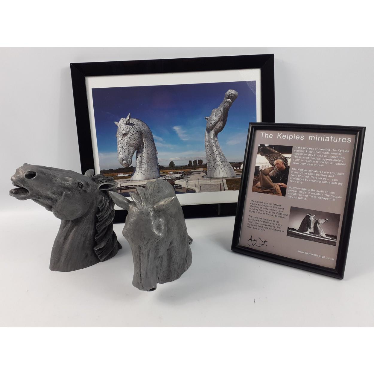 KELPIES - a pair of resin Kelpie statuettes standing approx 19cm high, plus a framed photo print of the full-sized Kelpies in situ (39x31cm approx)