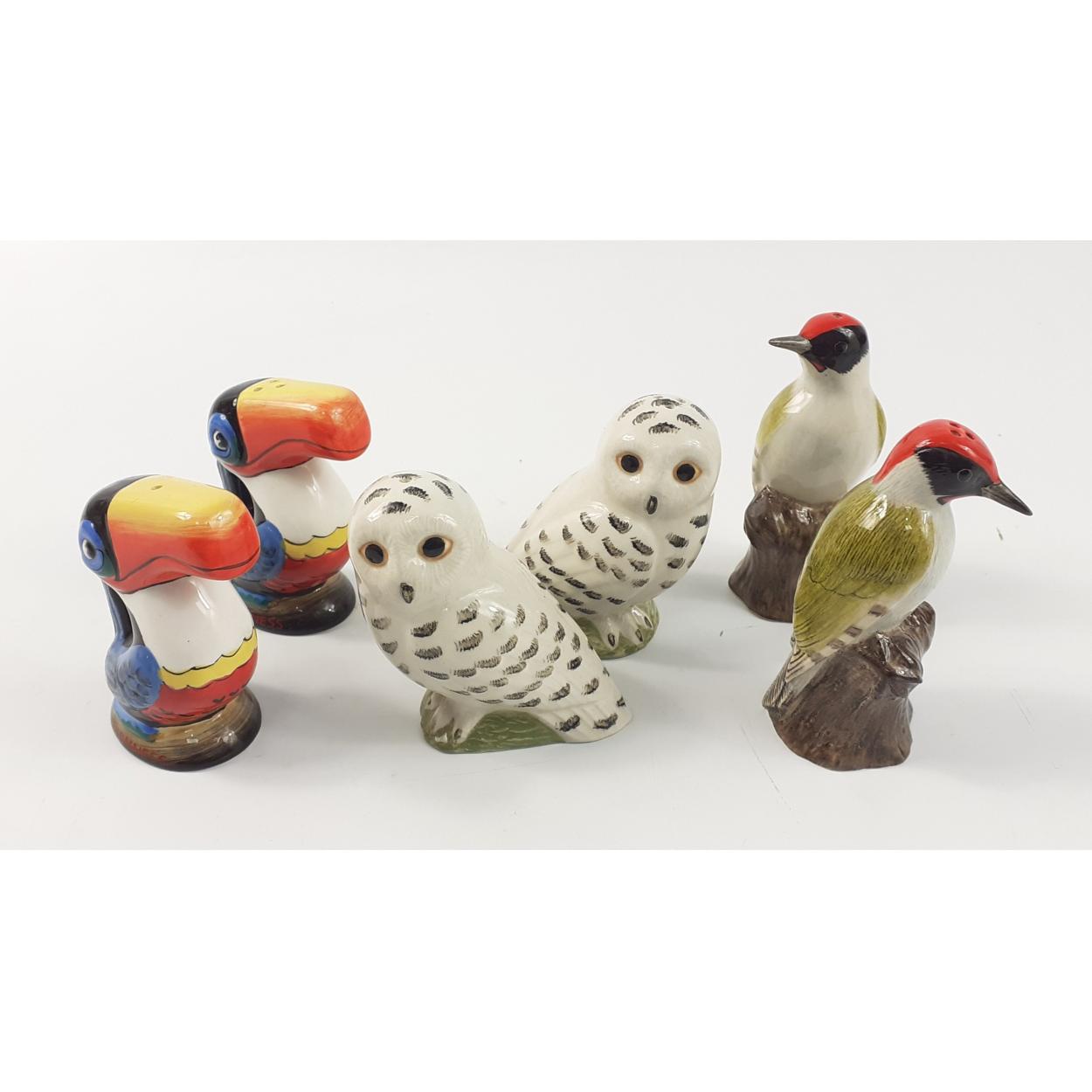 GUINNESS HERITAGE (G0075) toucan salt & pepper set, a QUAIL woodpecker salt & pepper set, and a pair of snowy owls salt & pepper set