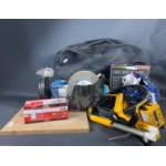 An extensive lot of tools to include a Kitchen Craft Italian Collection Cast Iron Mincer, 30cm high, an air brush set, a MEADE Readview handheld microscope in box, a KWB Germany GMBH drill set with instructions, a Trumeter road measuring device in case and a Work Zone sander on wooden base, 42cm long x 37cm wide. Condition - all in used/fair condition.