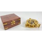 A marine sundial compass standing on 3 screws 13cm dia within a brass-bound wooden box 14x14x6cm