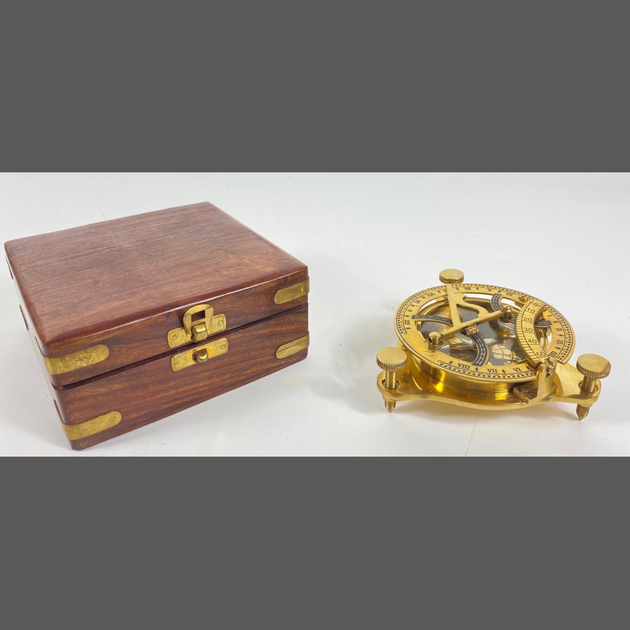A marine sundial compass standing on 3 screws 13cm dia within a brass-bound wooden box 14x14x6cm