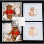 Two classic boxed as new WINNIE-THE-POOH limited edition collectable bears by GABRIELLE, with ROYAL DOULTON bone china miniatures.