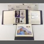 Three WESTMINSTER MINT padded collectors albums containing 11 royal commemorative coin and stamp covers, the Diamond wedding anniversary collection containing 7 coin sets and many other stamp sets, and the History of WWII with 5 coins