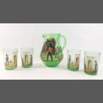 A set consisting of a hand-painted green glass water jug and 4 glasses, the jug decorated with a scene of a 19th century stagecoach and sentries and the glasses each with 2 sentries