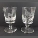 Two beautiful and substantial crystal goblets one with an etched pheasant and the other with an etched stag, each 16cm high