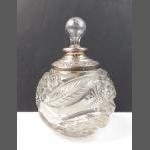 An antique cut glass bottle with attractive floral silver hallmarked collar, London 1904, with stopper. A few minor chips to interior of rim.