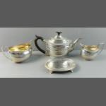 A four piece sterling silver tea service, hallmarked London 1904, maker's mark CS Harris and Sons teapot with wooden handle and finial in beautiful condition 515g approx, tray, sugar bowl and milk jug 498g approx