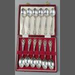 A beautiful set of twelve solid silver coffee spoons with thistle cut motif, hallmarked EDINBURGH with various 1970s dates, all matching patterns, weight 139g approx