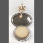 A small EP lot to include a 40cm pierced tray, a wooden centred cheeseboard, a set of 6 egg cups on tray