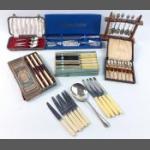 A selection of cutlery to include a boxed set of EPNS apostle coffee spoons, set of Insignia plate spoons, EPNS serving spoon, stainless steel knives, Queen Anne bread knife and cake slice, display stand with six South African commemorative spoons