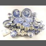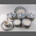 A large ALLERTON'S blue and white dinner service in the Pavilion pattern to include a pagoda tureen and 2 pagoda lidded serving dishes, 3 graduated ashets, 12 each of soup plates, side plates, dinner plates, dessert plates plus a sauceboat with underplate