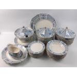 A large ALLERTON'S blue and white dinner service in the Pavilion pattern to include a pagoda tureen and 2 pagoda lidded serving dishes, 3 graduated ashets, 12 each of soup plates, side plates, dinner plates, dessert plates plus a sauceboat with underplate