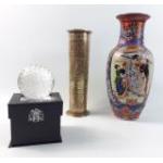 A 20th century Chinese vase 32cm tall, an embossed Indian vase 26cm tall, an Oleg Cassini signed and a boxed golf ball paperweight