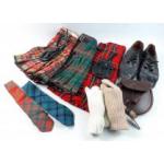 Three children's kilts to include a ROYAL STEWART by Lawries of Glasgow, W28" x L19", one unnamed W22" approx x L 15", and one with damage W24" x L16". Plus 3 day sporrans with belts - 2 for children, 1 pair of brogues size 9½, with wear, 2 tartan ties, 2 pairs of kilt hose
