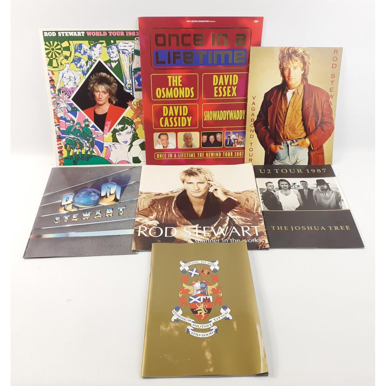 A small collection of big name concert programmes to include ROD STEWART Vagabond Tour, Spanner in the Works, The World Tour 1983-4, 1986/7 tour programme, U2 Tour 1987: The Joshua Tree, The Once in a Lifetime Rewind Tour 2007 (The Osmonds, David Essex, David Cassidy, Showaddywaddy) and an Edinburgh Military Tattoo golden anniversary souvenir programme