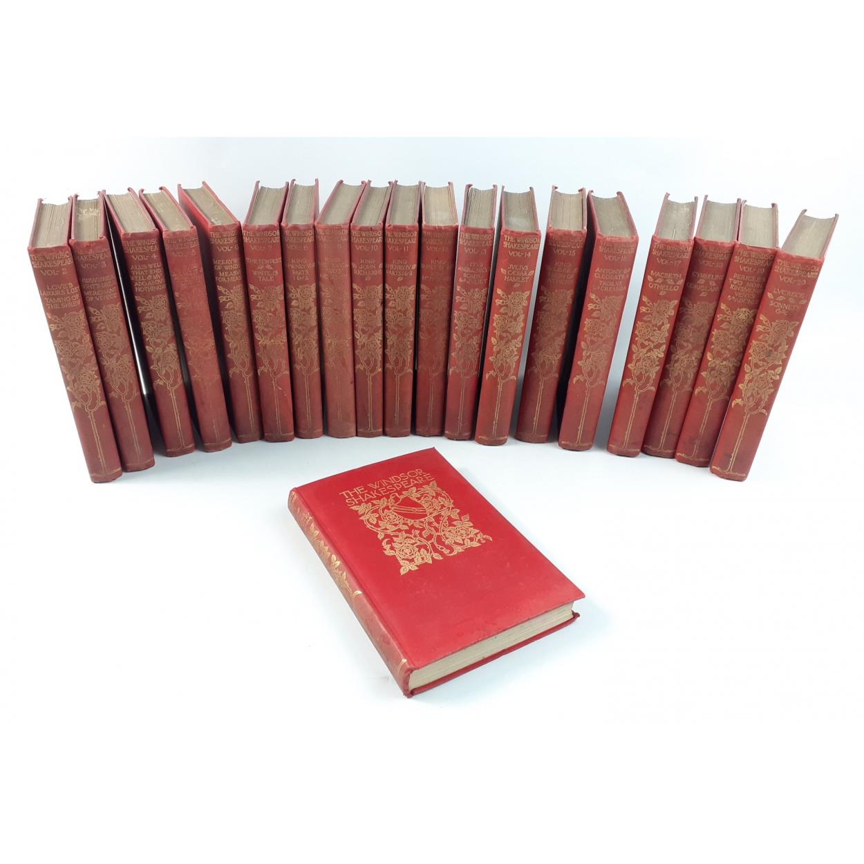 Twenty volumes of THE WINDSOR SHAKESPEARE edited by Henry N Hudson illustrated from the paintings of the great artists, published by The Caxton Publishing Company. Red cloth covers with gilt lettering. Some fading to the spines, generally good condition