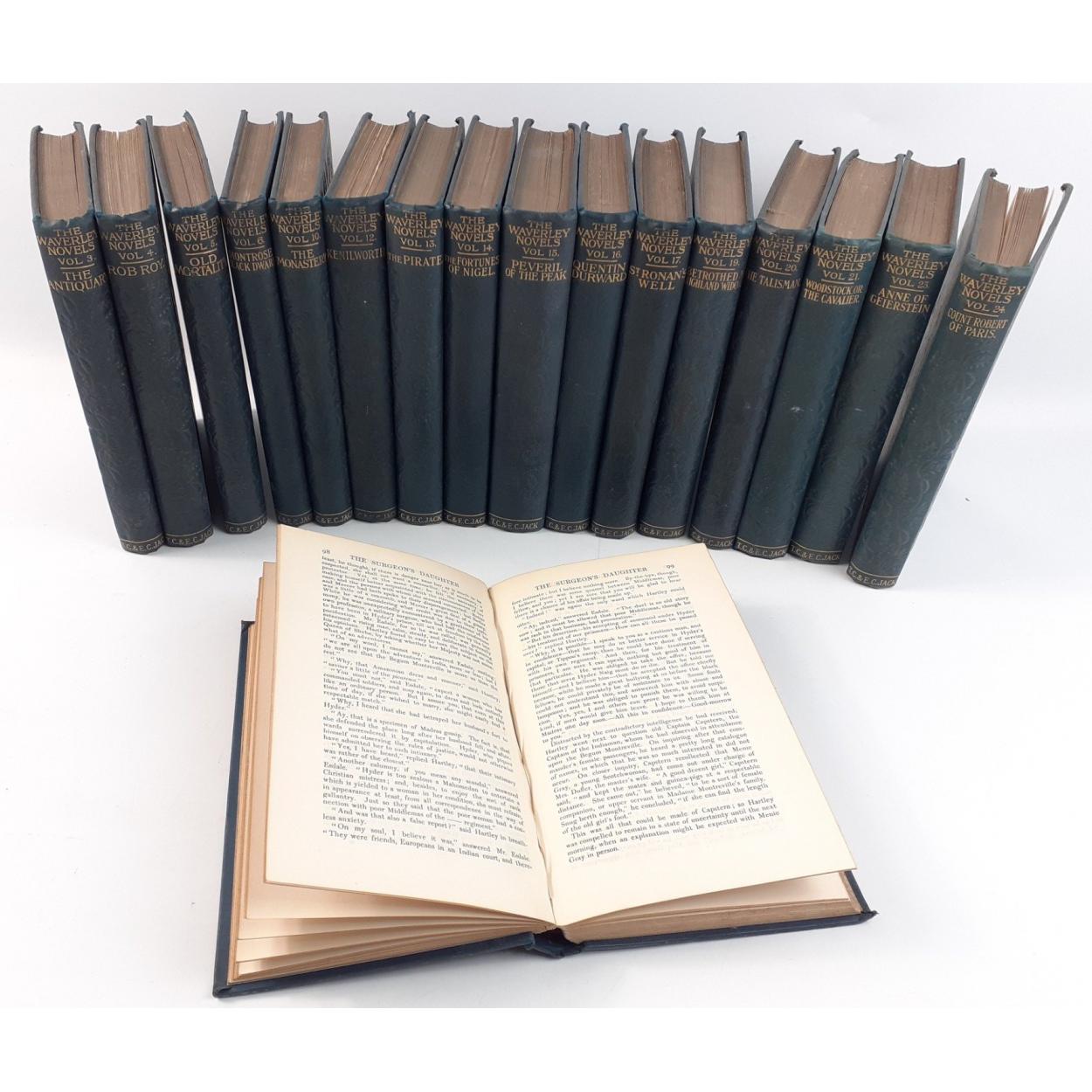 Seventeen volumes of THE WAVERLEY NOVELS by Sir Walter Scott published by TC & EC JACK, 'THE MELROSE EDITION'. Blue cloth covers with embossed thistle and gilt lettering to include volumes 1-6, 10, 12-17, 19-21, 23-25