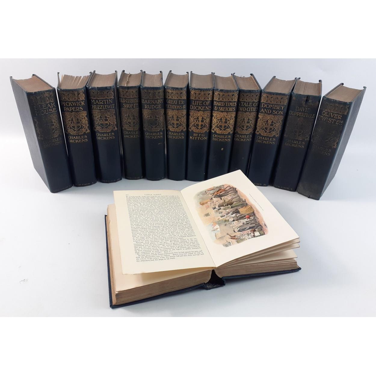 Thirteen volumes of CHARLES DICKENS printed by Ballantyne Hanson & Co in "THE LONDON EDITION" and published by The Caxton Publishing Co with blue cloth covers and gilt lettering, includes the Life of Dickens by FG Kitton.