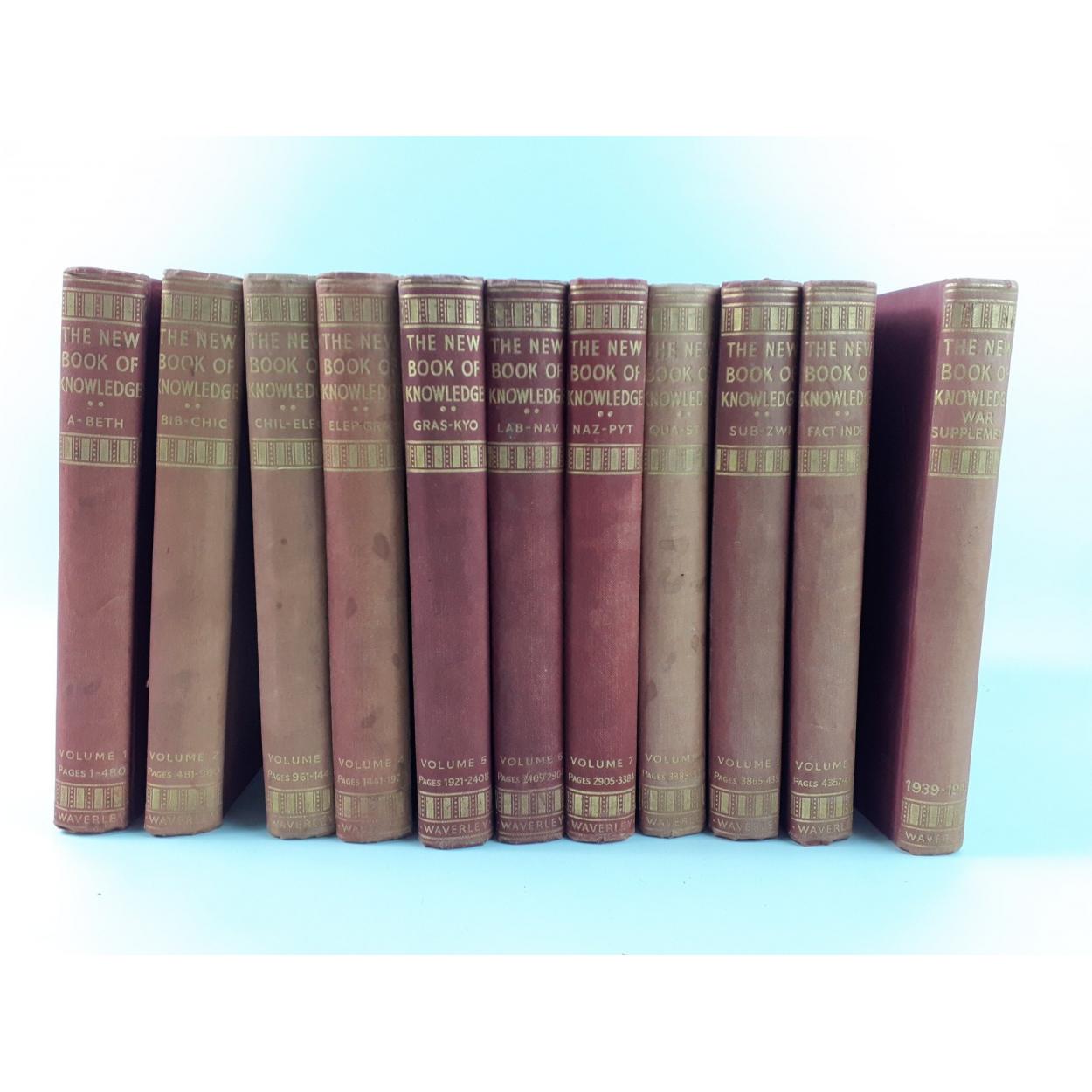 Eleven volumes of the NEW BOOK OF KNOWLEDGE including the WWII War Supplement, edited by Sir John Hammerton, published by The Waverley Book Company with red cloth covers, some fading but otherwise good condition