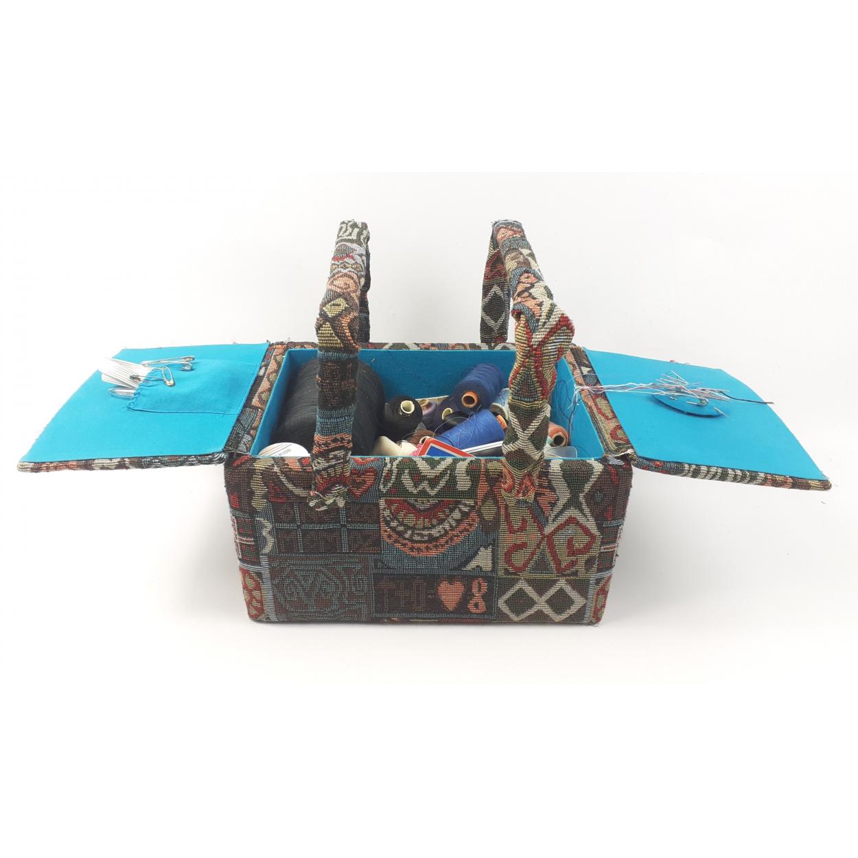 An embroidered sewing box with contents of threads, needles etc, 28x20x14cm approx