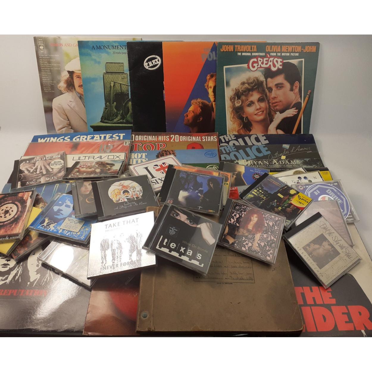 A box of LPs including Simon & Garfunkel, Hot Chocolate, Motown, The Police, Thin Lizzy, Supertramp, Ultravox, gramophone records and a quantity of CDs