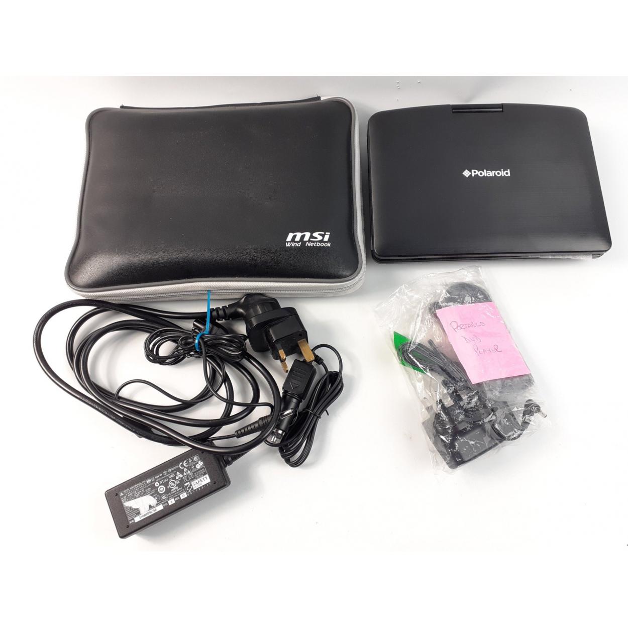 An MSi laptop in carry case and with charger. Factory re-set, in working order and a POLAROID portable DVD player with charger