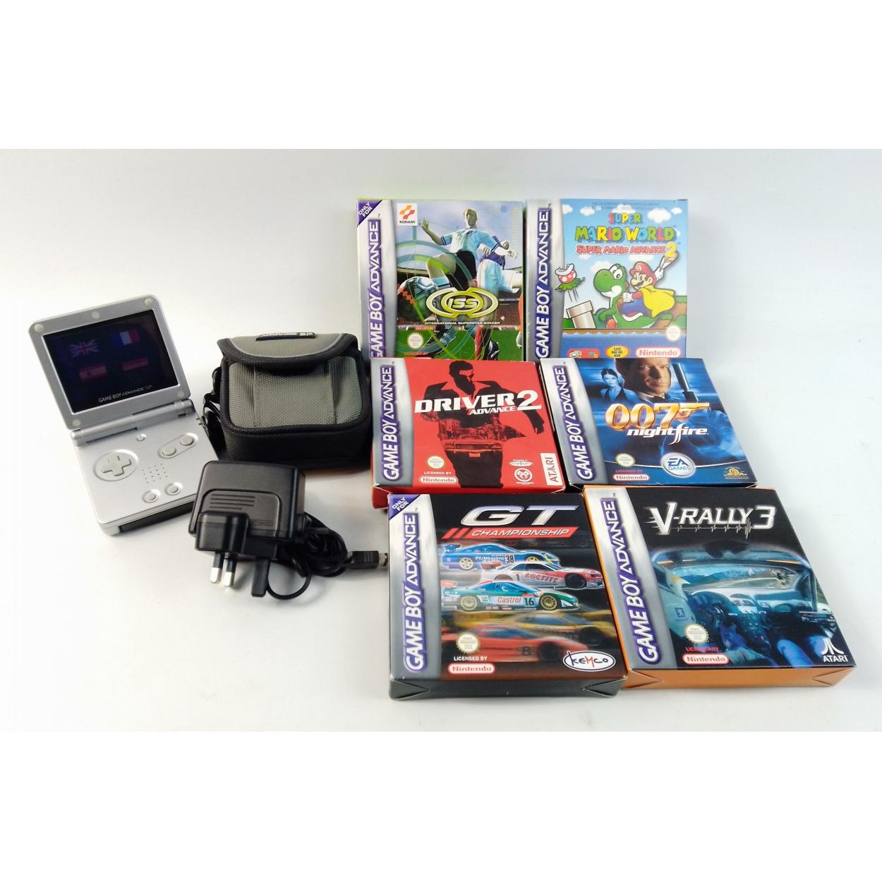 A GAME BOY ADVANCE hand-held console in travel case with charger with 6 games including Driver 2 Advance, V-Rally 3, 007 Nightfire, Super Mario World, International Superstar Soccer and GT Championship
