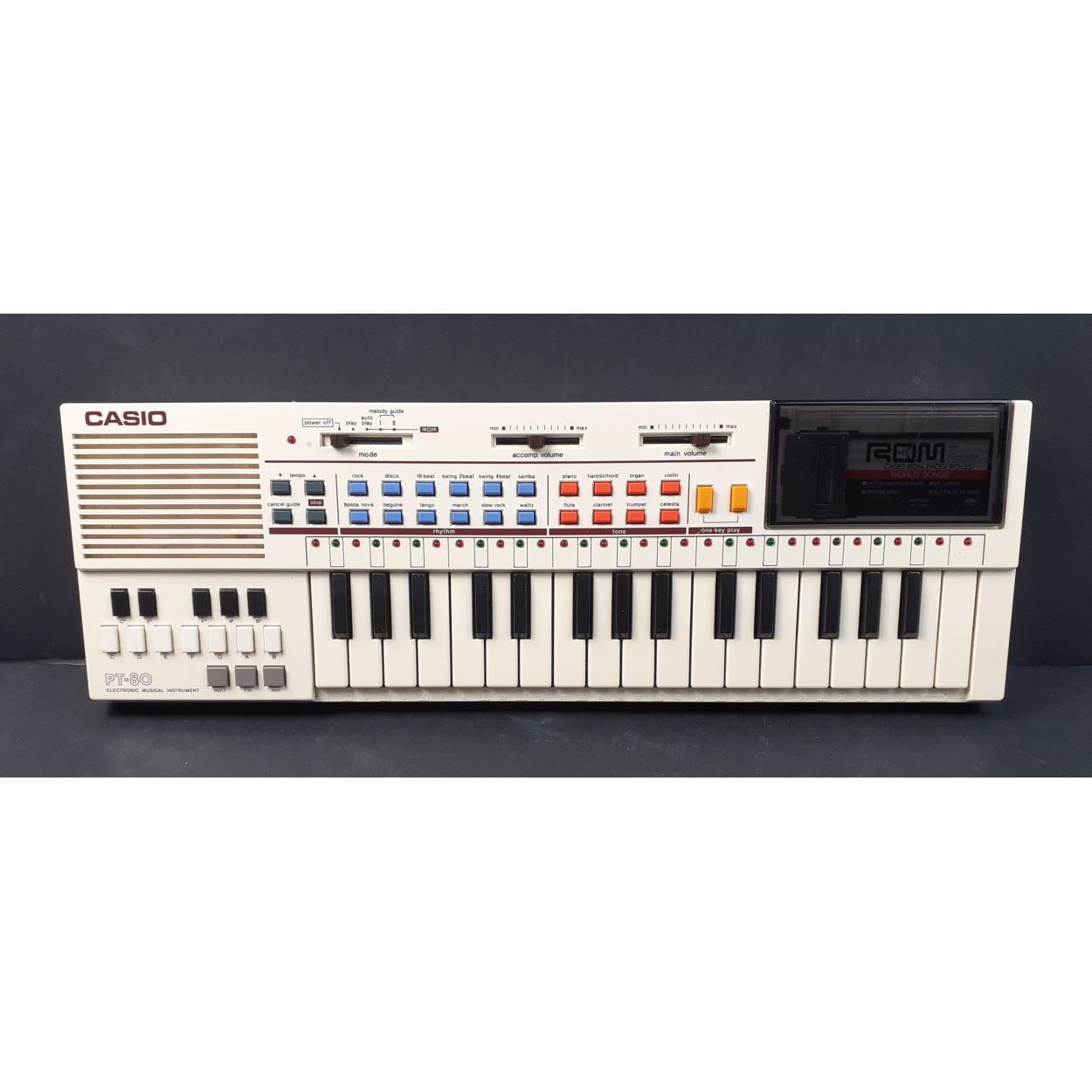 A CASIO PT-80 electronic musical instrument in good playing order. Comes with a ROM pack inserted.