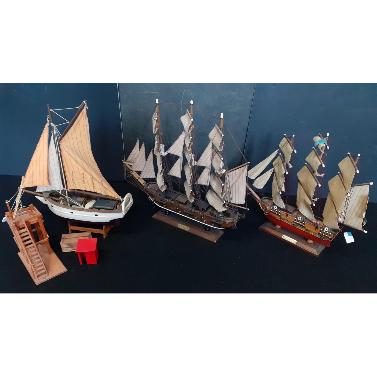 Three wonderfully detailed representations of sailing ships in wood to include USS Constitution, Spray and Fregata,
