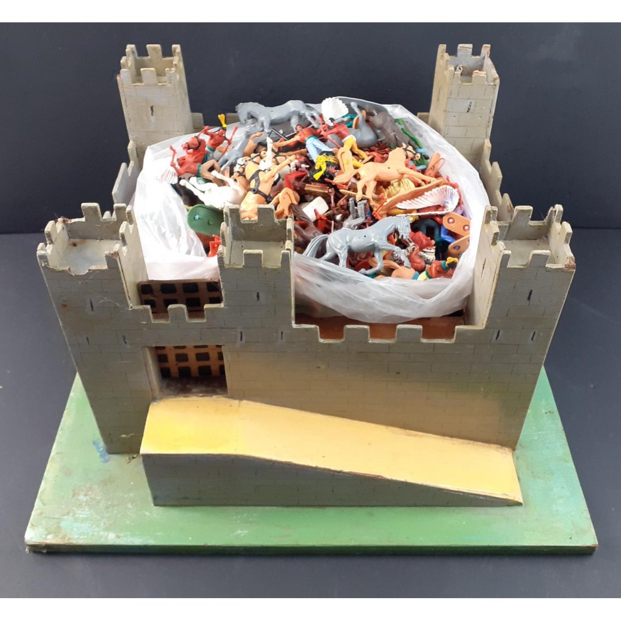 A home-made castellated toy fort with a selection of mainly TIMPO Wild West figures