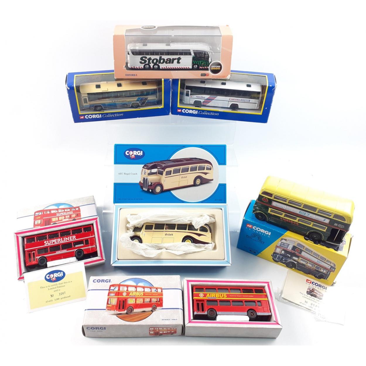 Seven CORGI ORIGINAL OMNIBUS limited edition 1:76 scale models to include 43313 Plaxton Premiere Plymouth Citycoach, 44201 Neoplan Cityliner Parrys International, 42703 Van Hool Alizee - Bus Eireann, 43901 Guy Arab Utility Bus Oxford Motor Services, 43903 Leyland Utility Bus - London Transport, 42704 Van Hool Alizee - Wallace Arnold Tours Ltd, and an OMNIBUS AEC 6441T Cardiff trolleybus Ltd, - Hancocks Amber Ale. All in excellent condition, slight damage to some boxes