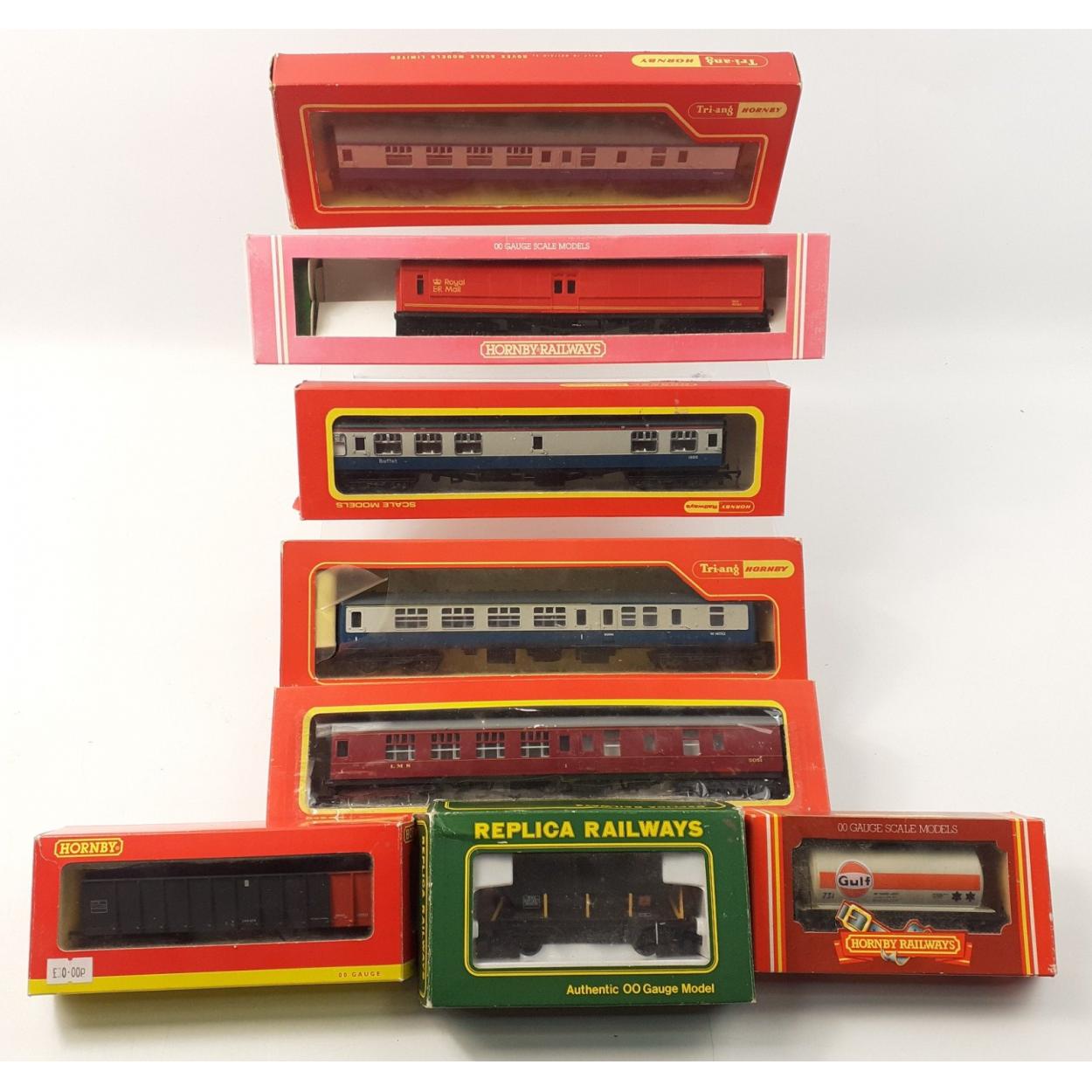 A selection of 8 HORNBY and other makes of carriages and rolling stock in boxes with signs of use.