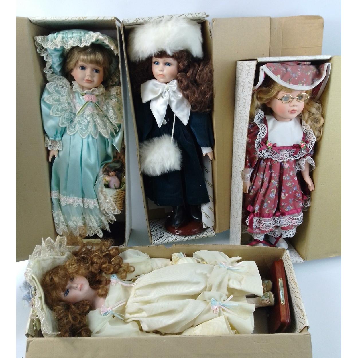 Four ALBERON COLLECTABLE DOLLS each 10" high, on stands. Dolls in good condition. Boxes with wear