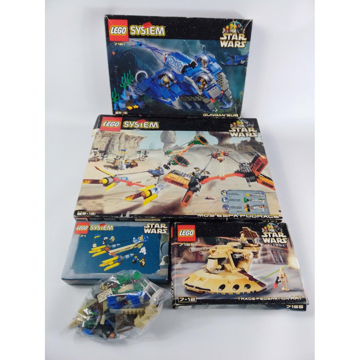Four boxed LEGO SYSTEM Star Wars kits, boxes with wear, believed complete comprising 7155, 7171, 7161 and 7171 fighter and a bag of loose components.