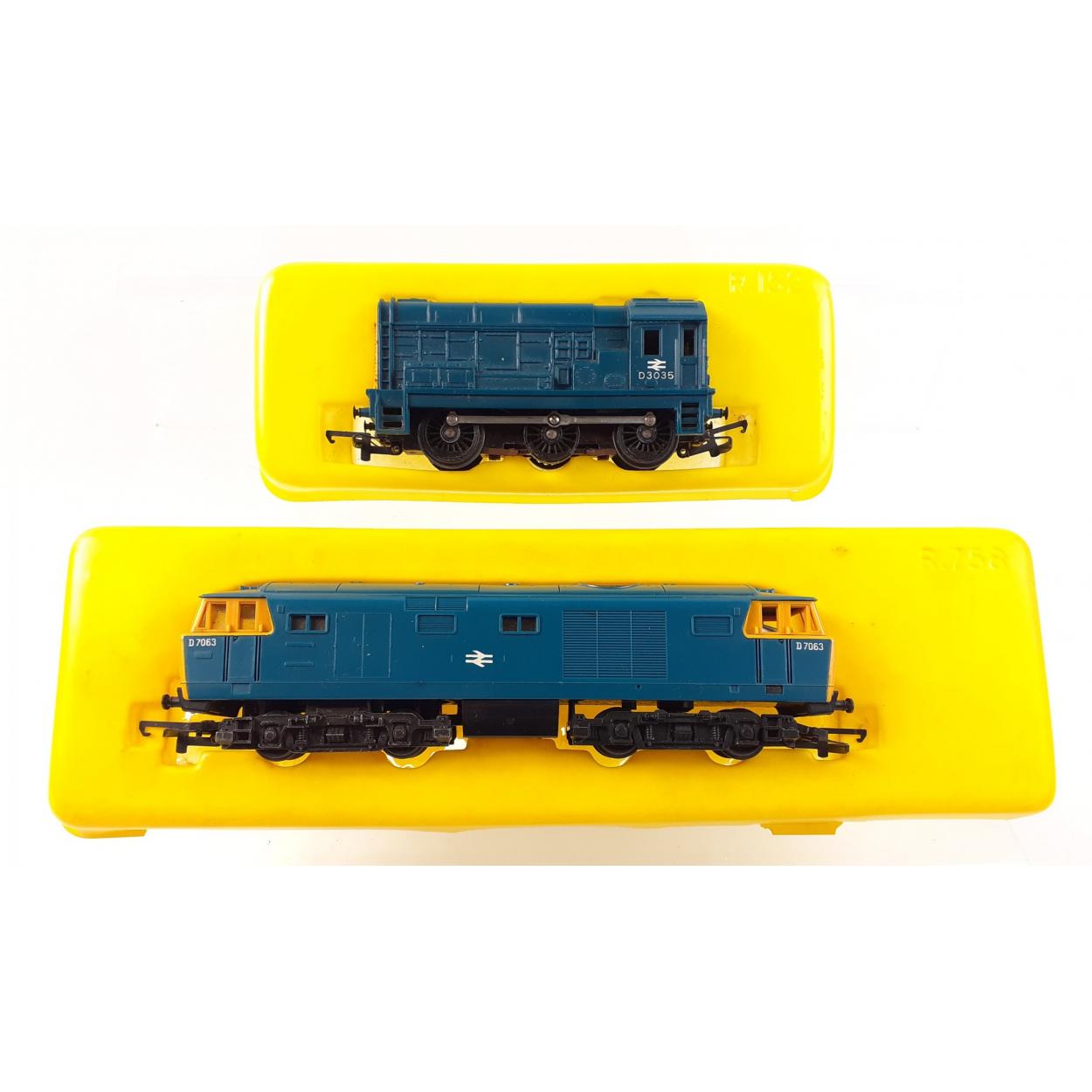A TRI-ANG HORNBY D7063 diesel locomotive R.758 and D3035 shunter loco model R.152. Both in good, used order