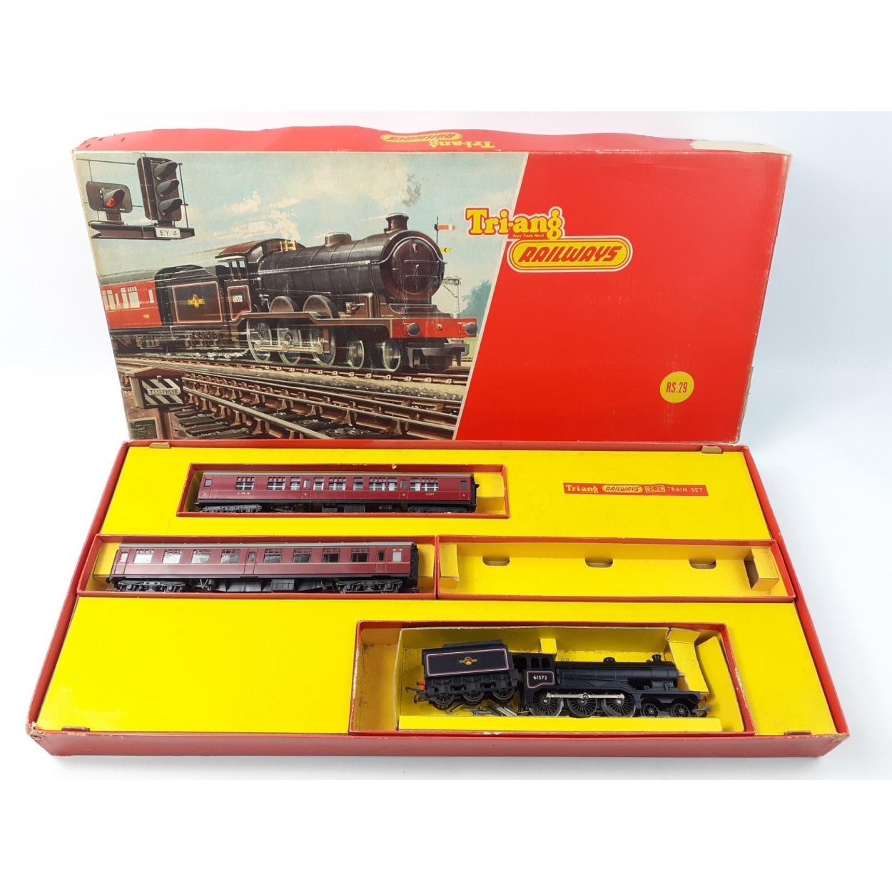 TRI-ANG Railway set model RS.29 in box. Comprises Loco 61572, tender and two carriages which all appear to be in good order. Box has wear.