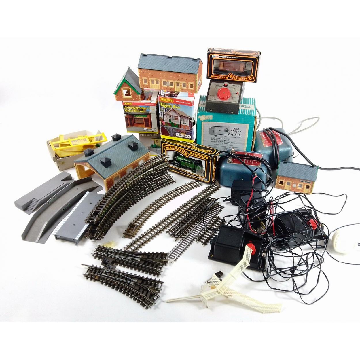 A great little lot of railway diorama layouts to include OO track, buildings and peripherals. Includes boxed transformer.