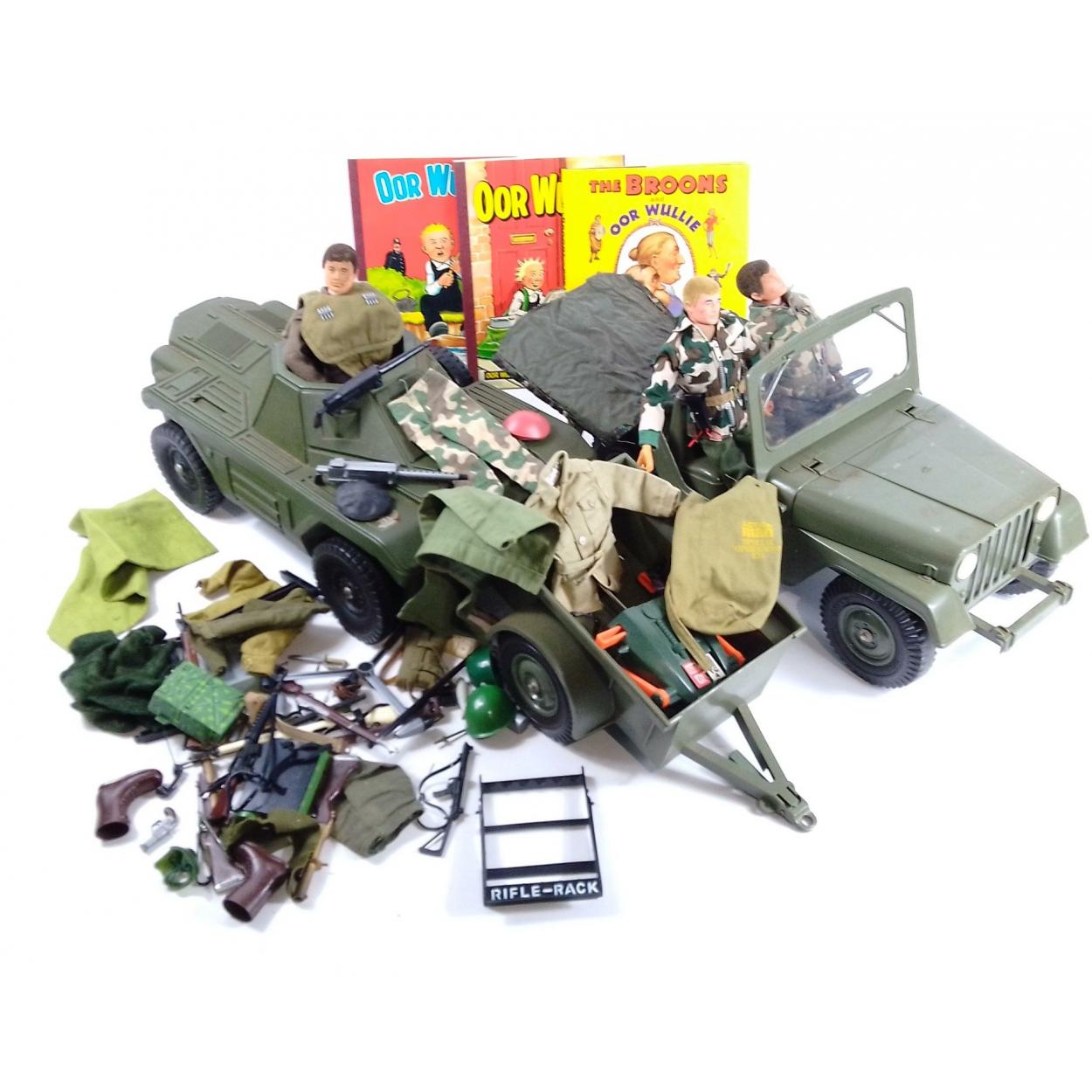 ACTION MAN ! What could be more 1970s than this great lot of Action Man figures and accessories. Fasten your flares, slip off your platform shoes and have great fun playing with this lot. Includes two vehicles and three earlier figures and a quantity of accessories.