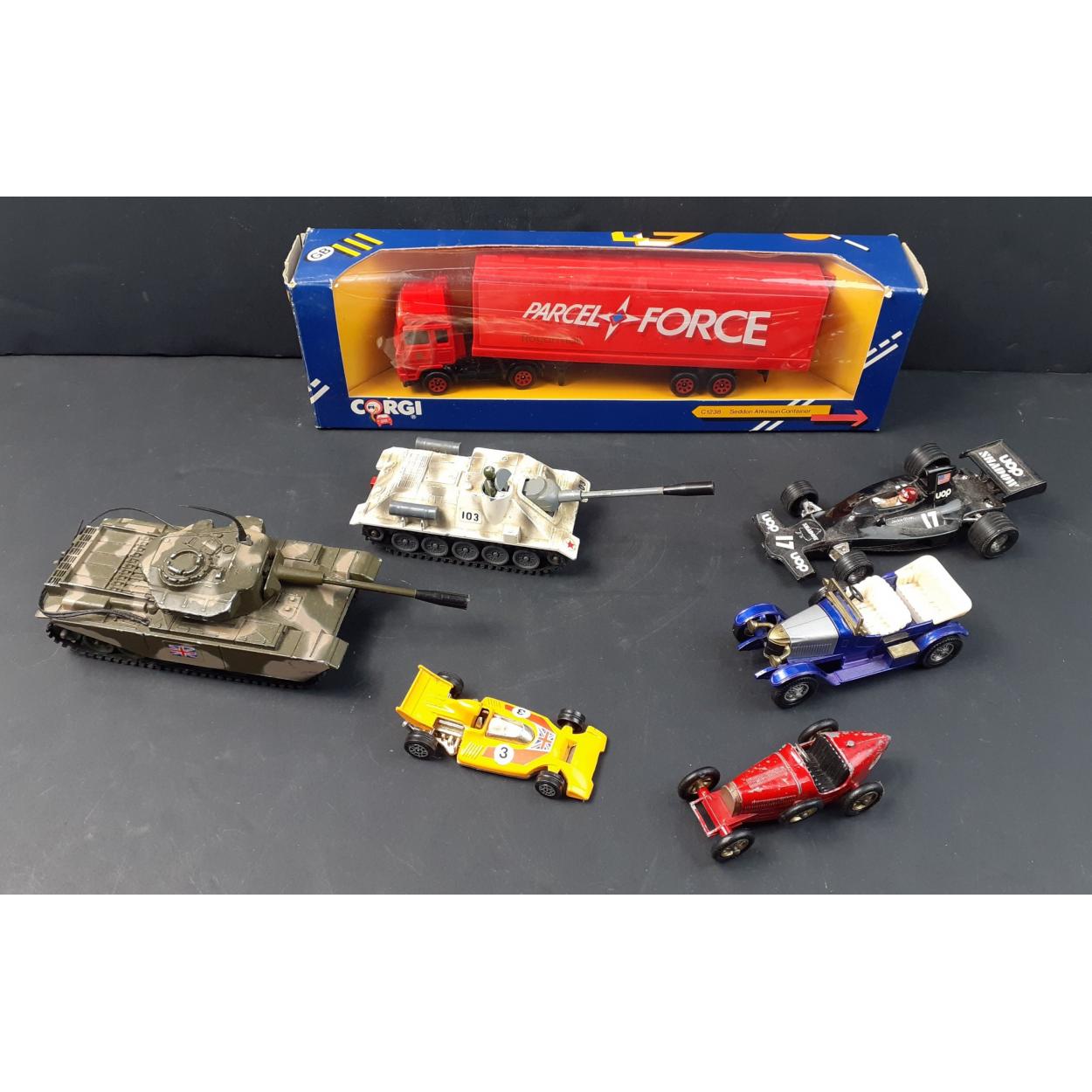 A small lot of diecast models. Includes boxed CORGI Parcelforce lorry, two CORGI diecast tanks and others.