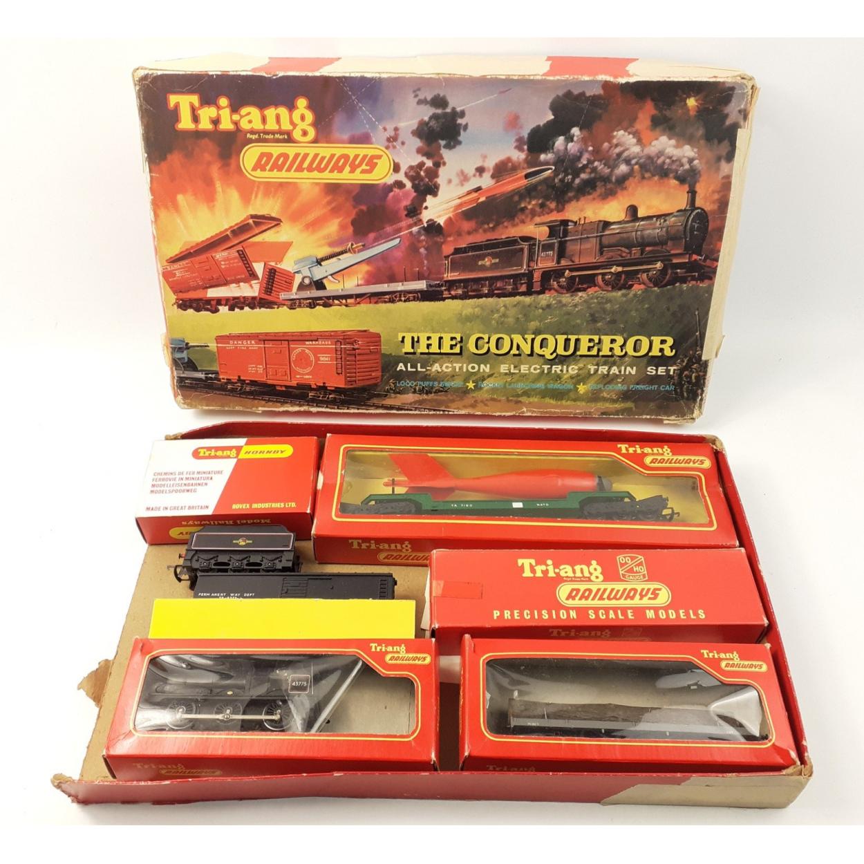 TRI-ANG THE CONQUEROR Rovex Railway set in original box. Box with wear and set with playwear. Missile unit seems in good order.