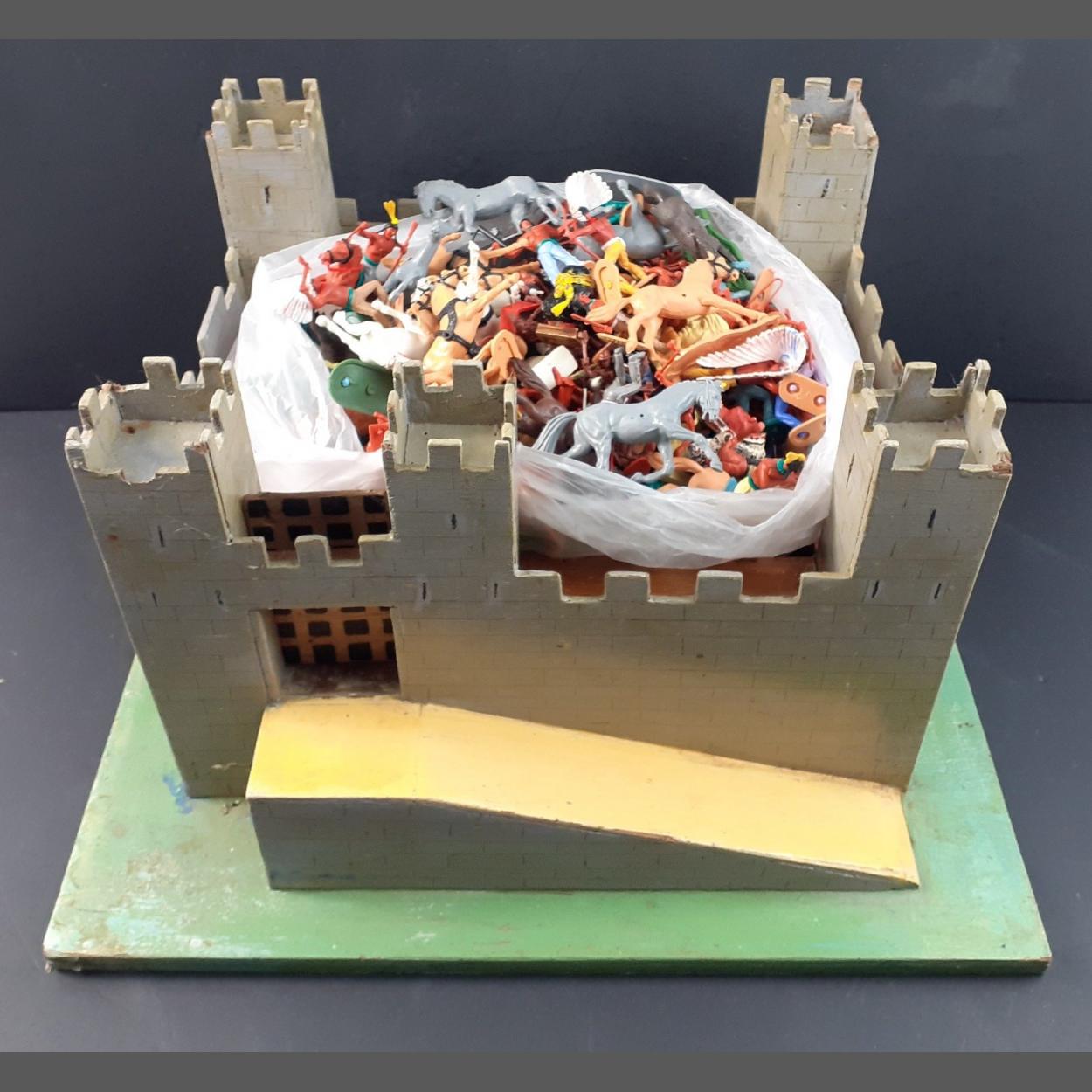 A home-made castellated toy fort with a selection of mainly TIMPO Wild West figures