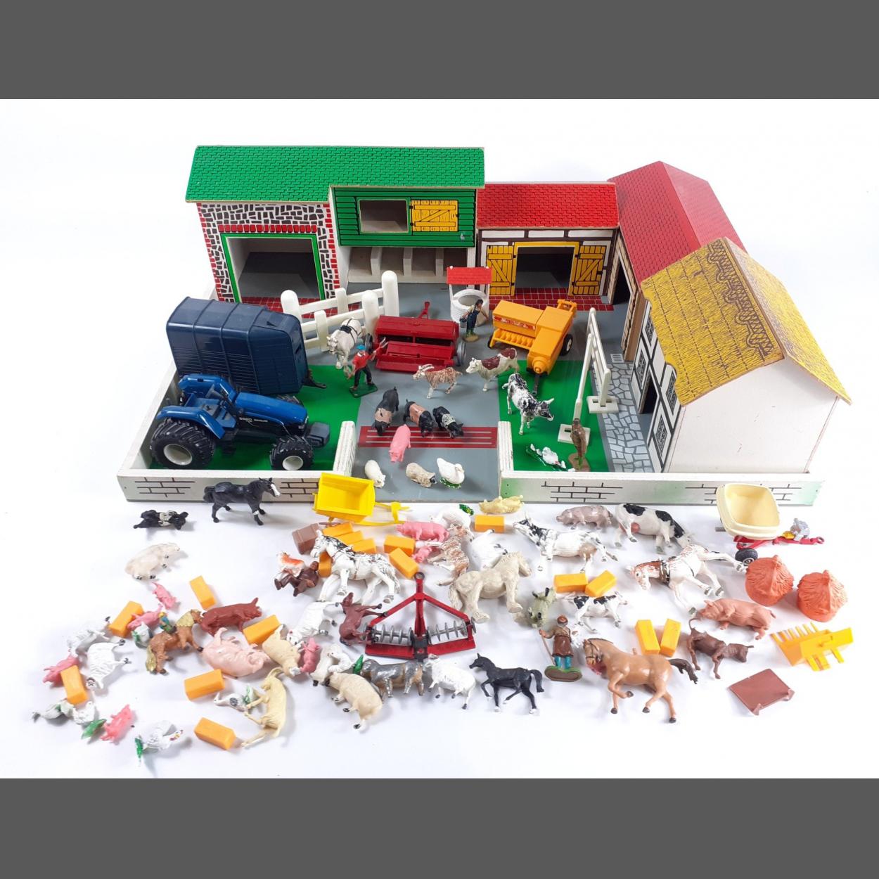 A child's hardboard farmyard set comprising a 60x45cm base, with buildings and a selection of diecast vehicles and farmyard animals