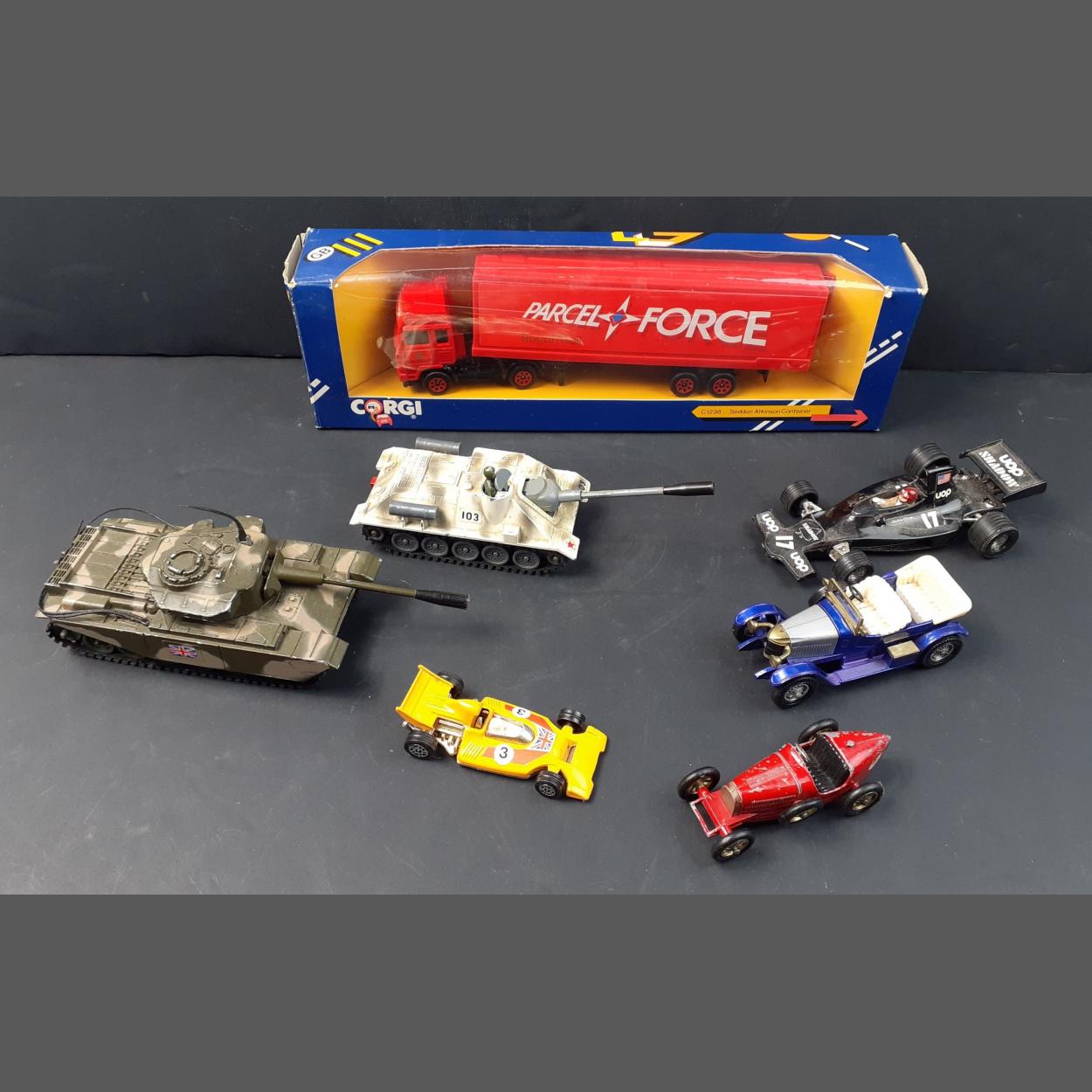 A small lot of diecast models. Includes boxed CORGI Parcelforce lorry, two CORGI diecast tanks and others.
