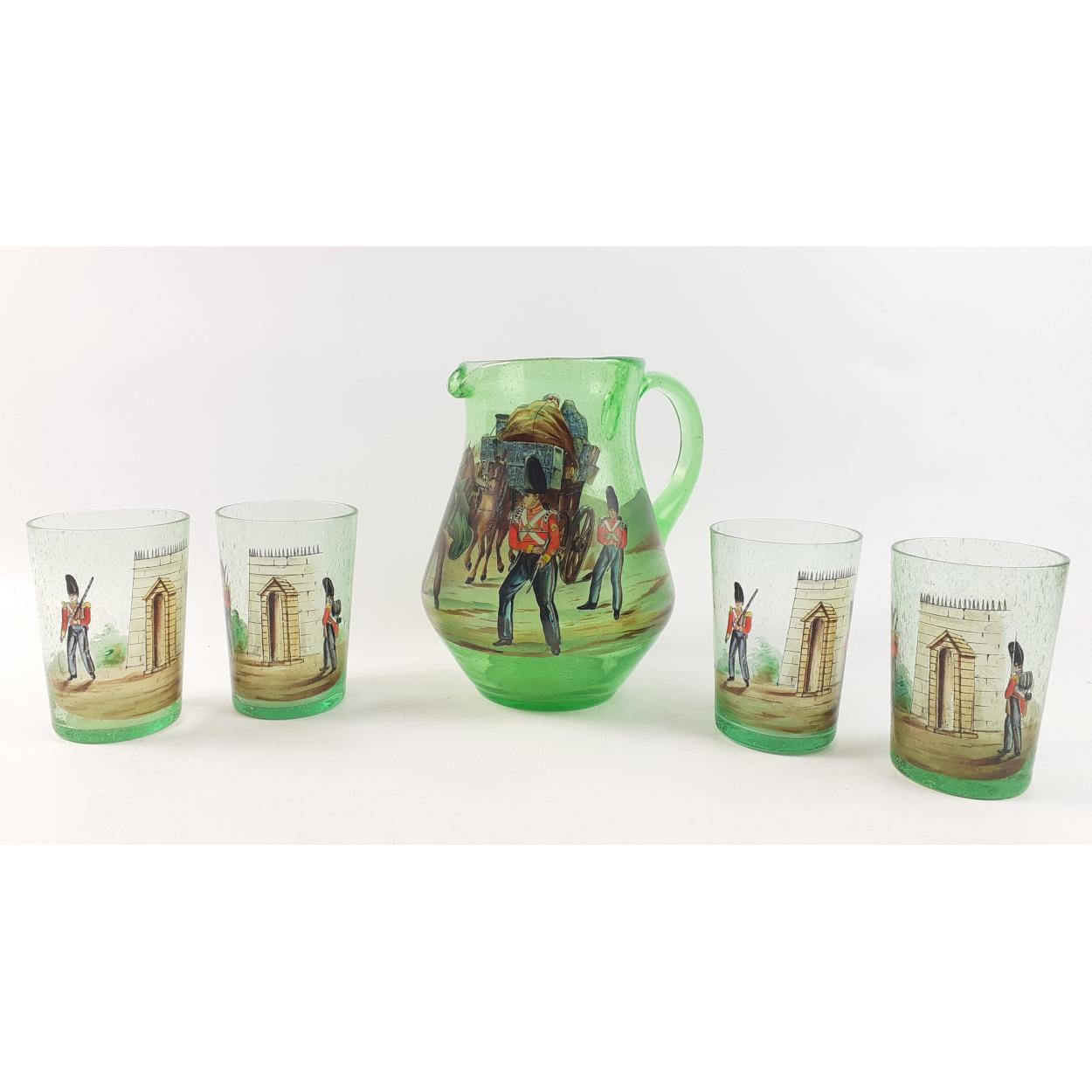 A set consisting of a hand-painted green glass water jug and 4 glasses, the jug decorated with a scene of a 19th century stagecoach and sentries and the glasses each with 2 sentries
