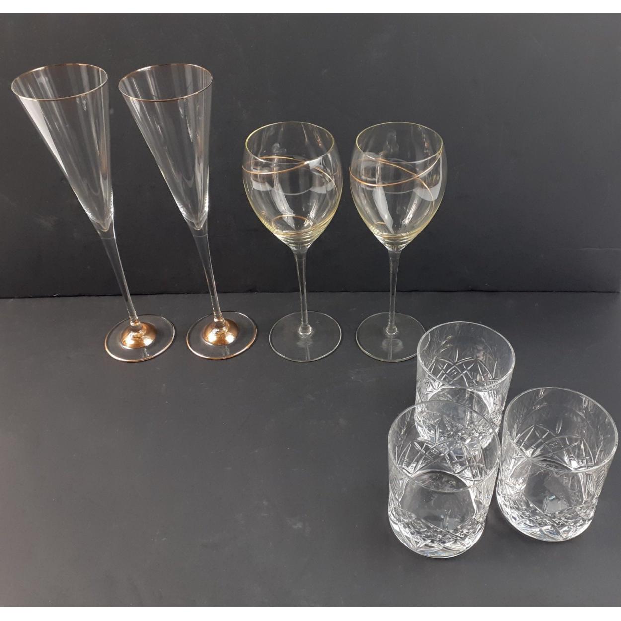 Three large EDINBURGH CRYSTAL whisky tumblers each with the lion rampant mark to base, plus 2 large wine glasses with gilt wire effect and 2 elegant champagne flutes (29cm high) with gilt to base
