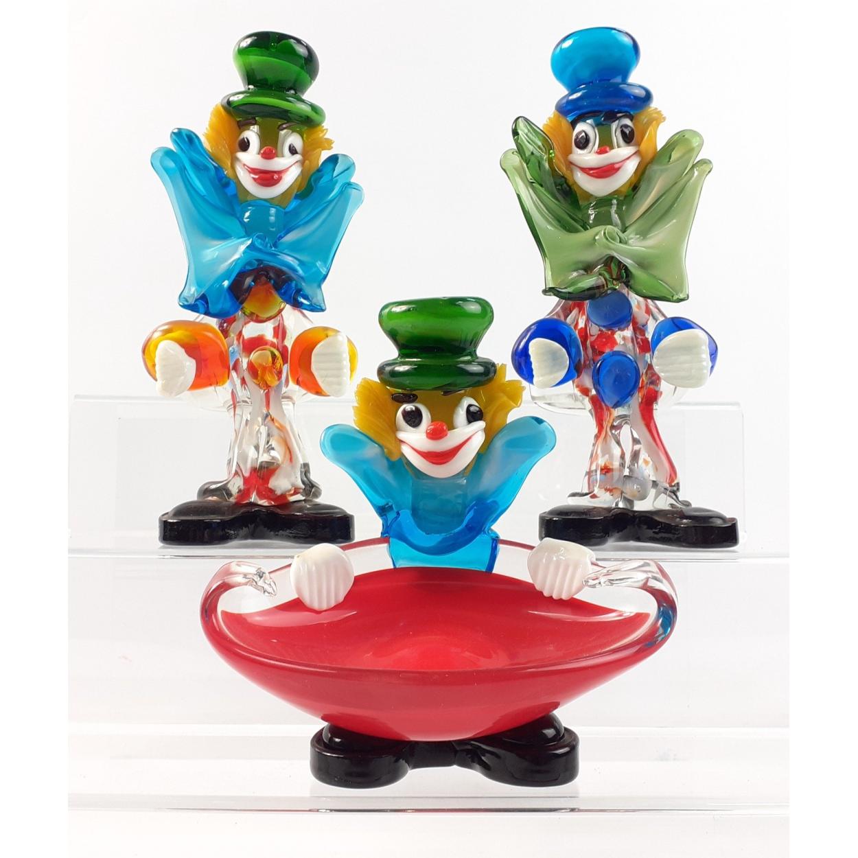 Three Murano style glass clowns, tallest 22cm, the smallest with attached trinket dish/ashtray