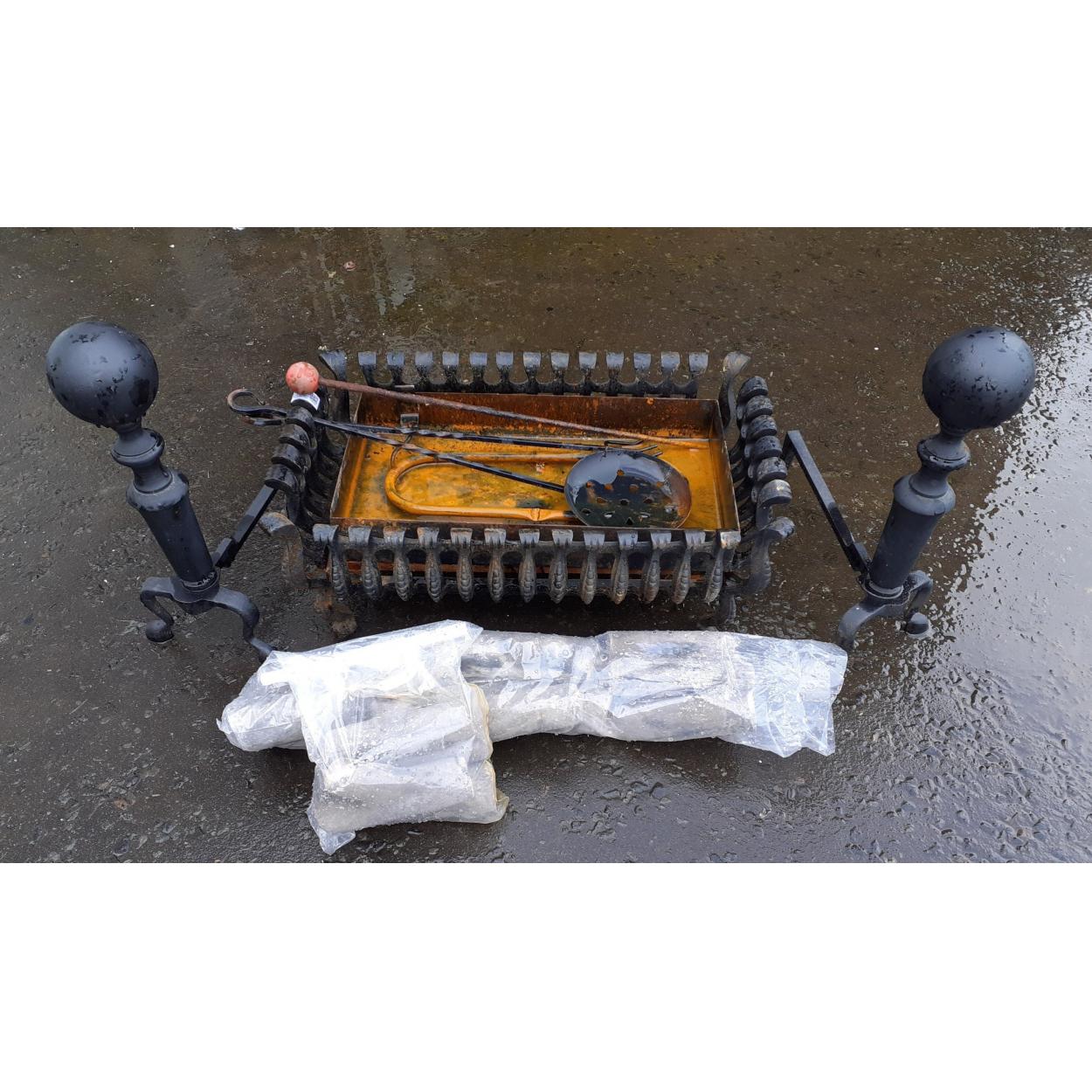 A cast iron fire grate with accessories, and 2 bags of lava stones, 56cm diameter